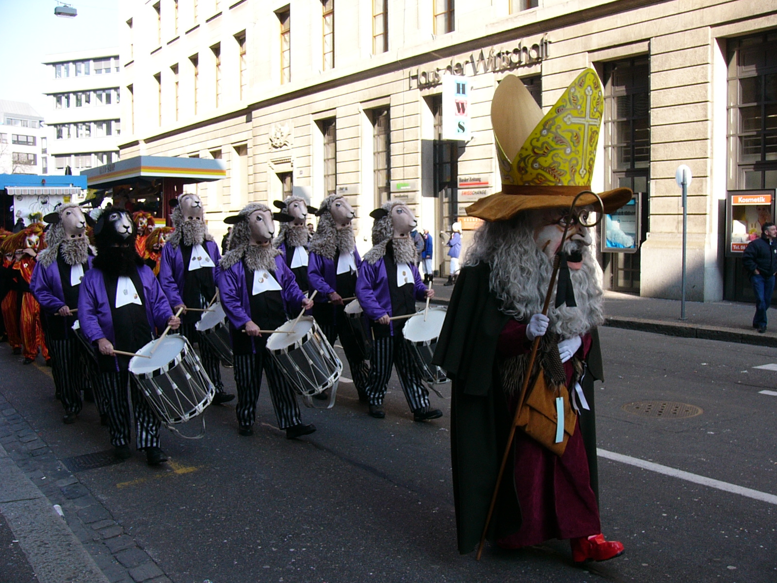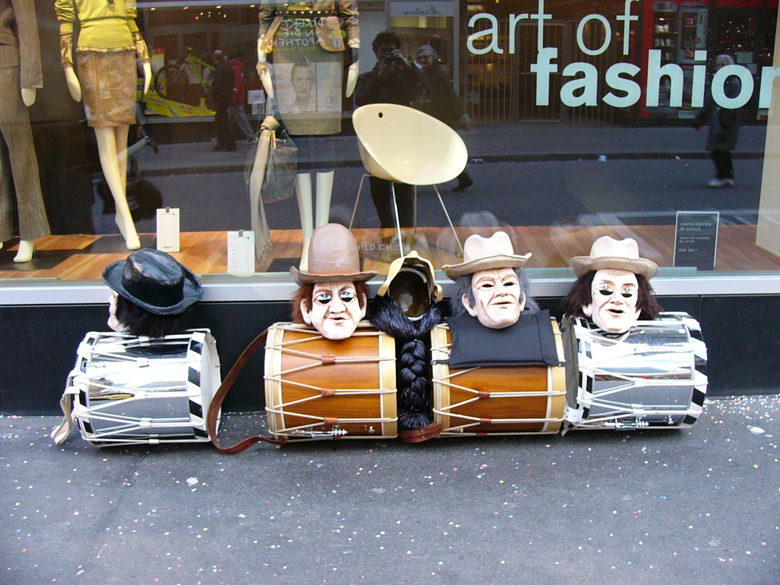 静かに行進しているのはまた別のグループ。太鼓とフルートの演奏でお祭りを盛り上げてくれる。近くで聞くとなかなか迫力があり、息のぴったり合ったなかなかの演奏だ。それもそのはず、この祭りのために各グループは、演奏の練習を1年も前から準備している。秋から年末になると練習量も増え、小学校の体育館などから音が聞こえてくる。このお祭りにかけるバーゼルっ子の意気込みが感じられる。
