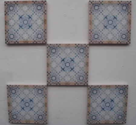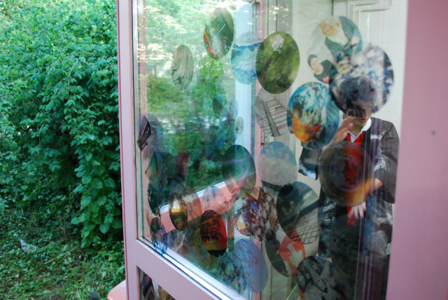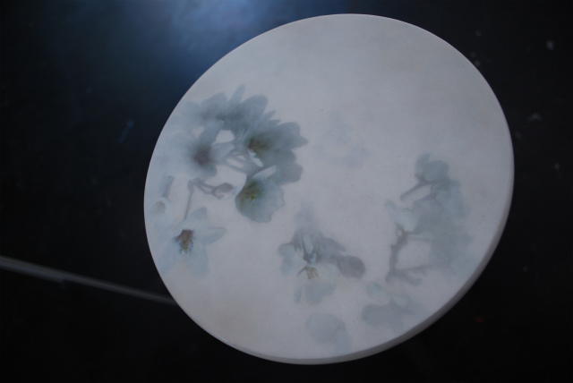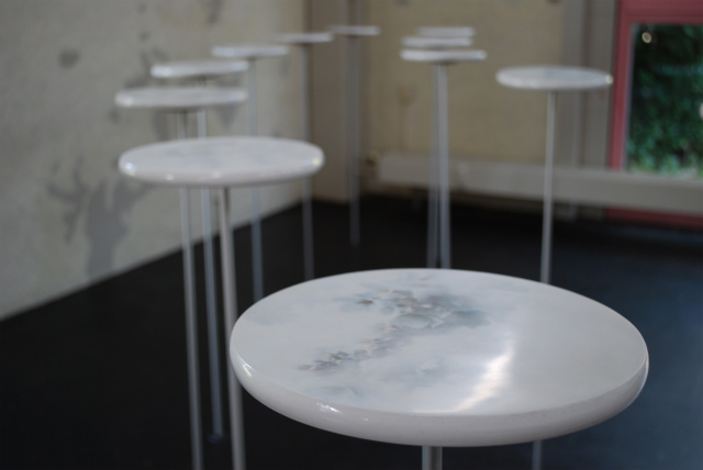 東亭: スイスで市販されている鍋置きをパネル代わりに使い、その上に昨年日本で撮影した桜の写真をインクジェットで出力したプリントを貼り、アクリル絵具と水性ニスを何層も塗り重ね、紙ヤスリで磨きあげたものです。