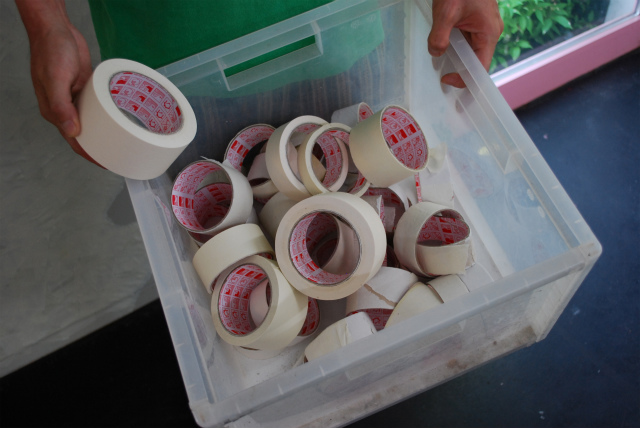 本来マスキングテープは、塗料を塗りたくない箇所を保護するためにテープでカバーしますが、この作品はテープ自体に塗料を塗っています。また、本来であれば塗料を塗りたい箇所に最低限のテープでカバーすればいいところを、無駄ともいえるくらい全面にテープをはりめぐらしています。これは本来の用途を無効にしていますし、新しい用途とも言えるのではと思っています。いわゆるモノ自体の境界ということです。