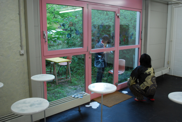 窓の外側と内側に分かれて、シールにした写真を交互に貼って行きます。